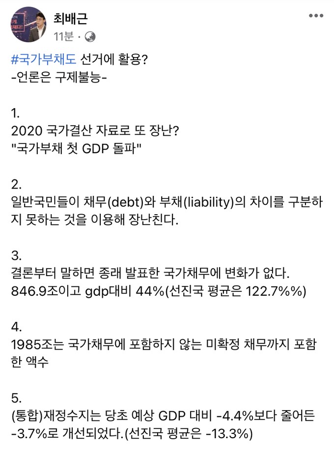 이에 최 교수는 같은 날 페이스북에 해당 언론이 언급한 ‘국가부채 첫 GDP 돌파’라는 문장을 명시하며 “일반 국민이 채무(debt)와 부채(liaility)의 차이를 구분하지 못하는 것을 이용해 (말)장난친다”고 했다.
