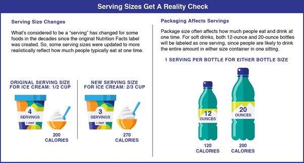 또 짚어볼 사항은 ‘1회 제공량(Serving size)’ 기준의 변화다. 법률에 따라 1회 제공량은 사람들의 ‘실제’ 식품 섭취량을 반영하게 되어 있으나, 지금까지의 1회 제공량 규정은 1993년 기준에 머물러 있었다. 이에 새로운 규정에서는 오늘날 미국인의 현실적인 식품 섭취량을 반영해 일부 1회 제공량 기준이 대폭 업데이트되었다. 또한, 식품이나 음료는 포장 단위가 같거나 다르더라도 개개인별 섭취량에 따라 1회 제공량 기준이 달라질 수 있음을 반영해, 식품 생산 및 유통 기업들이 1회 제공량 표기에 좀 더 주의를 기울이도록 규제가 일부 변경되기도 했다.