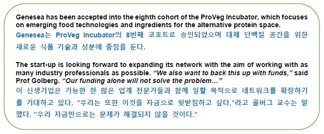 Golberg 교수는 Genesea가 대두 시장을 완전히 파괴할 것이라고 확신하지 않으며, 이는 큰 요구가 될 것이라고 제안했다. “대두 시장은 거대하다.”라고 그는 설명했다. "지구상의 바이오매스를 기반으로 하지 않는 새로운 유형의 단백질을 추가하기를 희망한다."