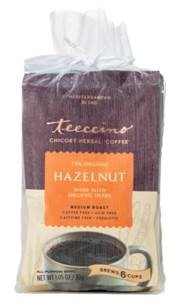 차(Tea) 디자이너 캐롤라인 맥두걸이 시작한 Teeccino는 치커리, 캐럽(carob.초콜릿 맛이 나는 암갈색 열매가 달리는 유럽산 나무), 민들레, 라몬씨(ramon seed.뽕나뭇과 식물의 씨앗) 등의 허브를 주재료로 한 커피 맛 음료이다. 커피와 같은 방식으로 브루잉이 가능하며 인공 감미료나 보존제, 카페인 등 없다. 심장 건강에 도움을 준다고 홍보하고 있다. 대체커피 외에도 35가지 유기농 차를 판매하고 있다. 사진의 제품은 헤이즐넛 향 대체커피로 웹사이트(https://teeccino.com/collections/herbal-coffee)에서 14.99달러에 판매 중이다. |