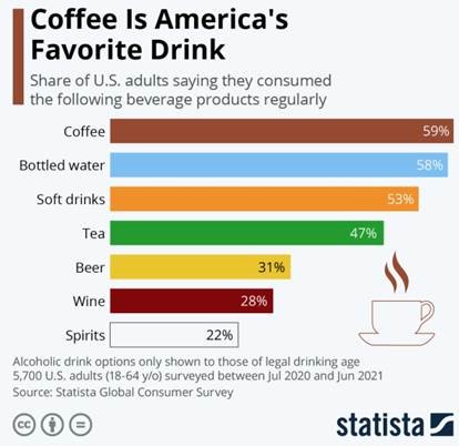 시장조사전문기관 스타티스타(STATISTA)가 10월 1일 국제 커피의 날을 기념해 발표한 데이터에 따르면, 미국인들은 물보다도 커피를 많이 마시는 것으로 나타났다. 순위를 살펴보면 1위가 커피(59%), 2위 병물(58%), 3위 소다 등 음료수(53%), 4위 차(47%), 5위 맥주(31%), 6위 와인(28%), 등으로 나타났다. 또한, 전미커피협회(National Coffee Association)가 올해 4월 발표한 통계에 따르면 코로나19 이후 미국인들의 가정 내 커피 소비는 기록적으로 증가했는데, 커피를 마시는 인구 중 85%가 집에서 하루 한 잔 이상의 커피를 마신다고 응답했으며 이는 전년 동기 대비 8% 증가한 수치다. 응답자의 하루 평균 소비량은 약 2컵으로 조사됐으며 약 60% 이상의 미국인들이 아침에 물 대신 커피를 마시는 것으로 나타났다. 이처럼 커피 소비량이 많은 미국에서 대체 커피가 대중화될 경우, 어떤 업체가 업계의 스타벅스 혹은 테슬라 역할을 하게 될지 관련 전문가들은 귀추가 주목된다고 밝혔다.