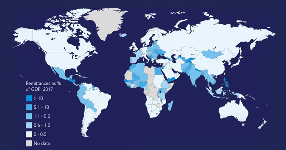 2021년 송금 수취인 상위 5개국은 인도, 멕시코(중국 대체), 중국, 필리핀, 이집트였다. 송금액이 GDP에서 차지하는 비중이 매우 높은 나라로는 레바논(54%), 통가(44%), 타지키스탄(34%), 키르기스스탄(33%), 사모아(32%) 등이 있다.
