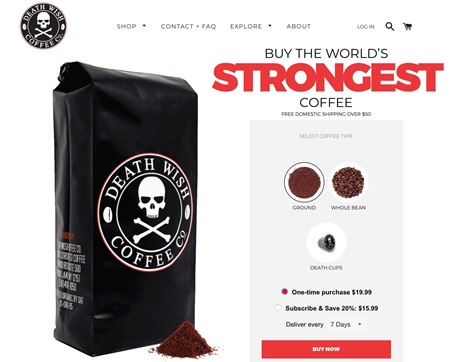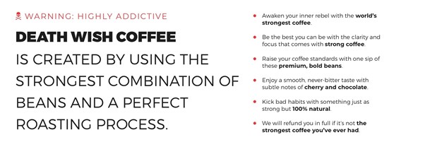많은 커피숍과 로스터가 "가장 부드러운" 또는 "가장 풍부한" 커피를 제공한다고 주장란다. 하지만 데스 위시 커피는 "세계에서 가장 강한 커피"를 판매함으로써 커피 한 잔에 추가적인 자극이 필요한 사람들을 만족시키는 것을 선택했다.