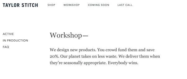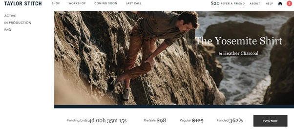 테일러 스티치는 신제품 개발을 위해 크라우드 펀딩에 의존하는 의류 회사이다. 일부 소비자는 크라우드 펀딩을 활용하는 기존 브랜드에 대해 눈살을 찌푸리기도 하지만, 이 회사는 크라우드 펀딩을 USP의 일부로 활용하기 때문에 그렇지 않다.