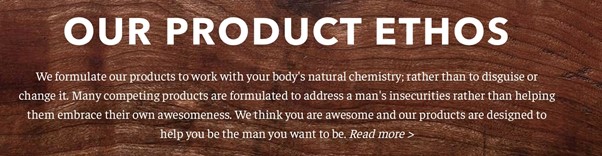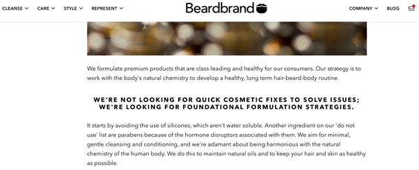 남성과 여성을 위한 많은 화장품 회사들은 근본적인 원인 대신 증상만 해결하면서 저렴한 가격으로 빠른 해결책을 제공하려고 한다. 비어드브랜드의 USP는 업계 표준과 즉시 차별화되는 제품 정신의 형태를 취했다.