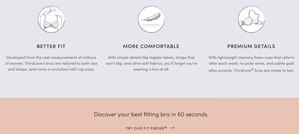 서드 러브의 USP는 강력한 약속이다. 다른 브랜드에서는 구매자를 돕기 위해 사이즈 차트를 제공하지만, 서드 러브는 개인의 필요에 따라 올바른 핏을 제공하는 것을 우선시했다.