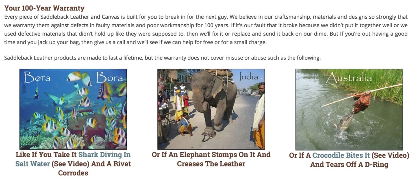 새들백 레더 제품의 독특한 가치를 잠재 고객들에게 즉시 전달하는 문장으로, 특유의 불손한 어조로, 이 제품은 매우 잘 만들어져 주인보다 오래 살 것이다. 이 메시지는 또한 100년 보증을 직접적으로 언급하는데, 이는 제품이 평생 동안 지속될 것이라는 보장과 함께 약속을 뒷받침한다.