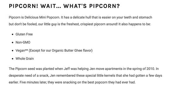 '올 내추럴', '통곡물', '소량' 등의 문구가 봉투에 표시되어 있으며, 브랜드 사이트에서는 글루텐 프리, 유전자 변형 성분이 없는 제품, 항산화제 등의 건강상의 이점을 강조한다. 핍콘은 또한 스낵 식품이 건강하다고 말하는 것이 아니라 어떻게 건강한지에 대해 구체적으로 설명하며 고객들이 관심을 가질 수 있는 차이점을 나열한다.