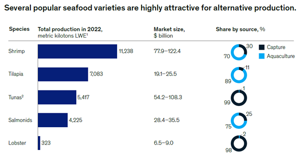 지금까지 대체 단백질은 닭고기, 돼지고기, 소고기 등 널리 소비되는 세 가지 육류에 집중되어 왔다. 그러나 해산물은 훨씬 더 다양한 식품군으로, 전 세계적으로 여러 어종이 대량으로 소비되고 있다. 어종 수준에서 대체 해산물의 잠재적 가치 제안을 이해하기 위해 몇 가지 인기 있는 해산물 품종을 살펴보고 총 생산량, 공급원별 점유율, 시장 규모를 비교했다(표 1).