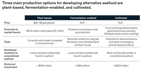 대체 해산물에는 식물 기반, 발효 가능, 양식의 세 가지 주요 생산 옵션이 있다(표 2).
