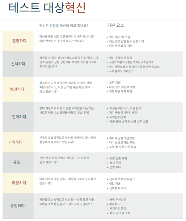 첫 번째 네 가지는 전략적이고 창의적인 성격으로, 혁신이 성공할 가능성이 높은 조건을 설정하고 우선순위를 정하는 데 도움이 된다.