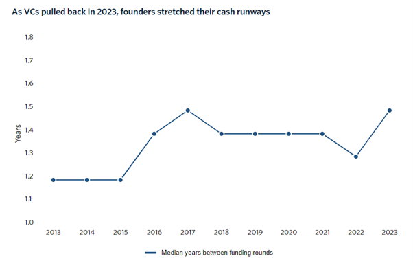 PitchBook 데이터에 따르면 2020년과 2021년 사이에 라운드를 유치한 미국 스타트업의 약 55%가 아직 라운드를 종료하거나 새로운 라운드를 유치하지 못했으며, 상당수가 현금 경색에 직면할 것으로 예상된다. VC의 지원을 받은 기업의 라운드 간 평균 기간은 2022년 1.27년에서 2023년 1.51년으로 증가했다.